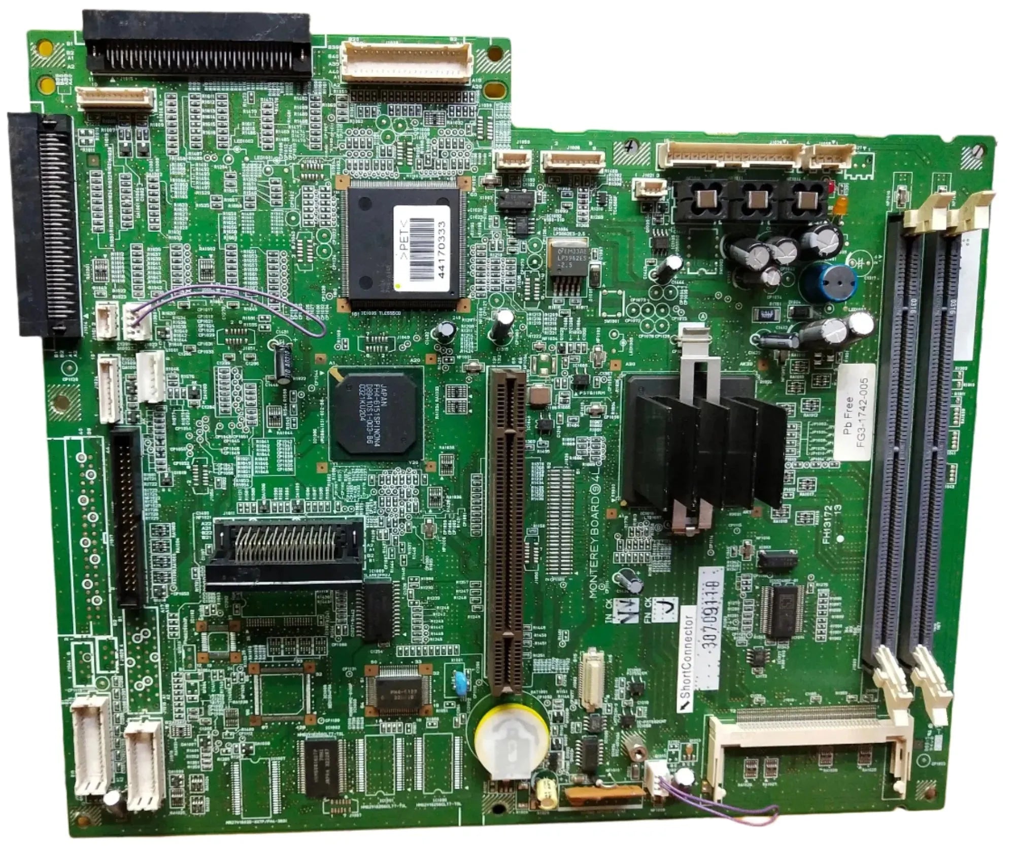 मॉडल संगतता: कैनन इमेजरनर 3300 और संगत मॉडल कार्य: मदरबोर्ड प्रिंटर के लिए केंद्रीय प्रसंस्करण इकाई (सीपीयू) के रूप में कार्य करता है, जो प्रिंट कार्य, स्कैनिंग, कॉपीिंग और प्रिंटर के घटकों (जैसे, फ्यूज़र, डेवलपर, ड्रम, आदि) के बीच संचार जैसे प्रमुख कार्यों को नियंत्रित करता है। यह प्रिंटर के नियंत्रण कक्ष और अन्य जुड़े उपकरणों से भेजे गए डेटा को संसाधित करके मुद्रण कार्य करता है। सामग्री: प्रिंटर के आंतरिक इलेक्ट्रॉनिक्स के लिए डिज़ाइन किए गए उच्च-गुणवत्ता वाले इलेक्ट्रॉनिक घटकों और टिकाऊ सामग्रियों से निर्मित। स्थान: प्रिंटर के मुख्य भाग के अंदर स्थापित, आमतौर पर नियंत्रण कक्ष और अन्य महत्वपूर्ण घटकों जैसे बिजली आपूर्ति और इंजन नियंत्रण बोर्ड के पास स्थित।