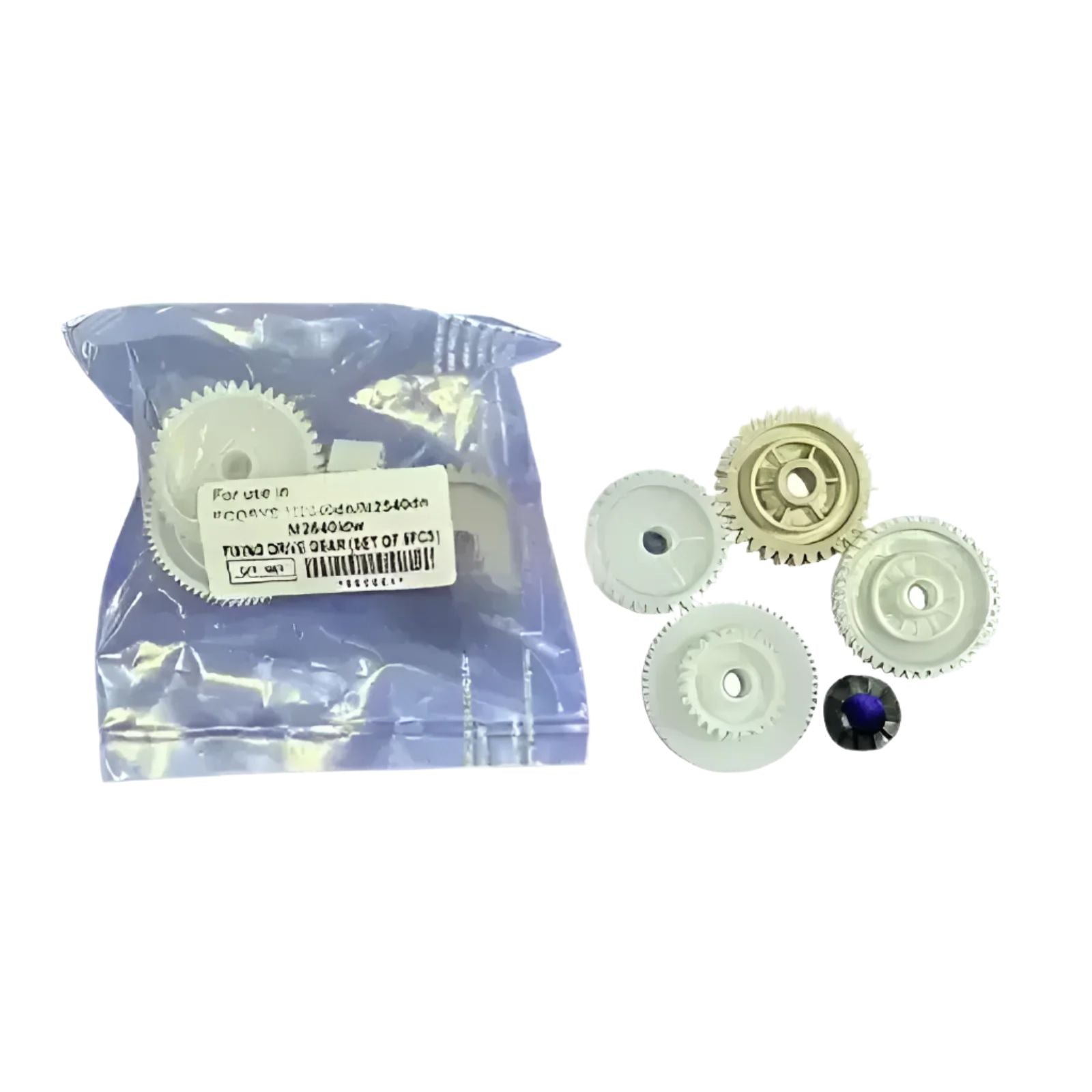 The 2040 Fixing Drive Gear (Set of 5 Pc) is a set of replacement gears used in the Canon imageRUNNER 2040 series of multifunction printers, specifically in the fuser unit. These gears are responsible for transmitting the mechanical energy required to drive the fuser rollers, which play a critical role in the process of bonding toner to paper during printing. Features: Material: The Fixing Drive Gears are typically made from durable plastic or a combination of plastic and metal. These materials are designed to withstand the mechanical stresses and heat involved in the fusing process, ensuring long-term durability. Set of 5 Pieces: The gears are sold as a set of five pieces, allowing for the replacement of multiple gears if necessary. This ensures that the fuser unit's drive system remains functional and smooth.